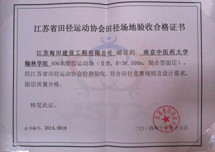 熱烈祝賀我公司承建的翰林學院400米塑膠運動場被評為“江蘇省合格田徑場地(Ⅱ)”